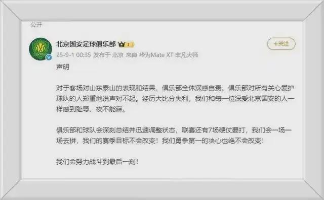 为安抚球迷,国安俱乐部在凌晨0点35分发出官方声明,为球队的0-6惨败道歉。